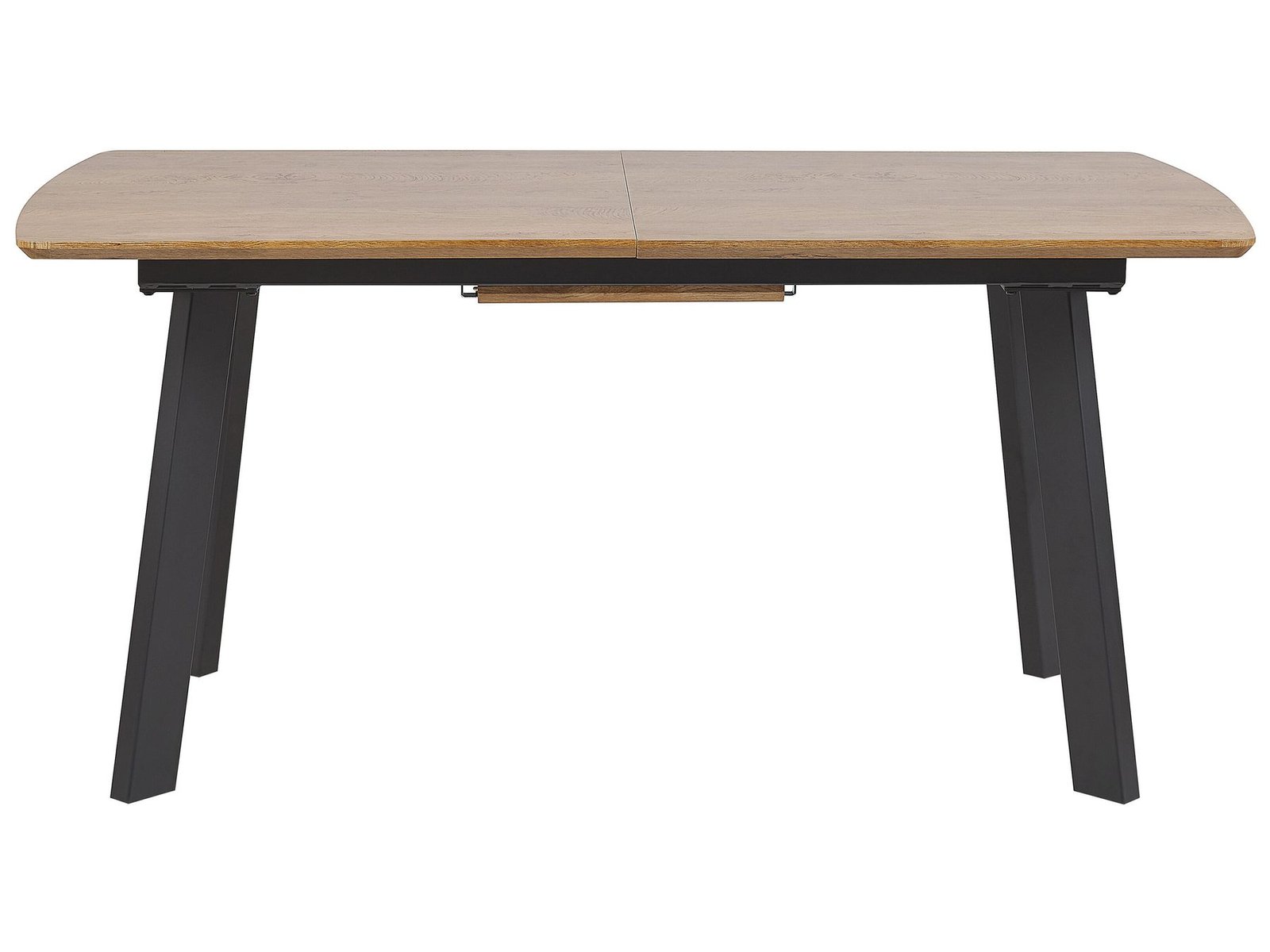 Create a functional space in a breeze with this stylish dining table, designed to suit modern homes. It easily extends from round to oval thanks to a discreet butterfly mechanism—perfect when you need a bit of extra room. The wood-effect paper finish gives it a warm, natural look, while the sturdy metal legs add a sleek, contemporary touch. Ideal for everyday meals or hosting guests without the fuss.