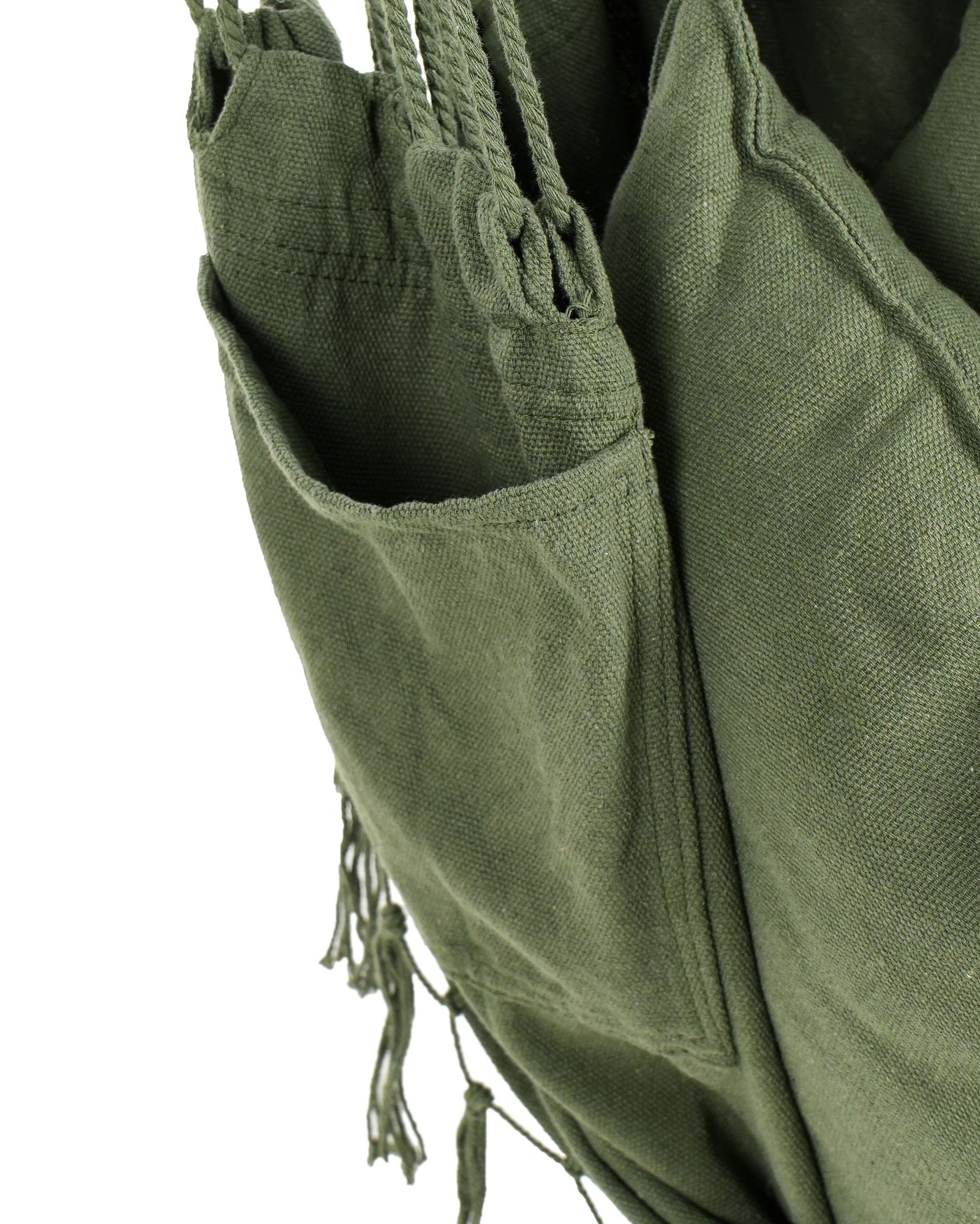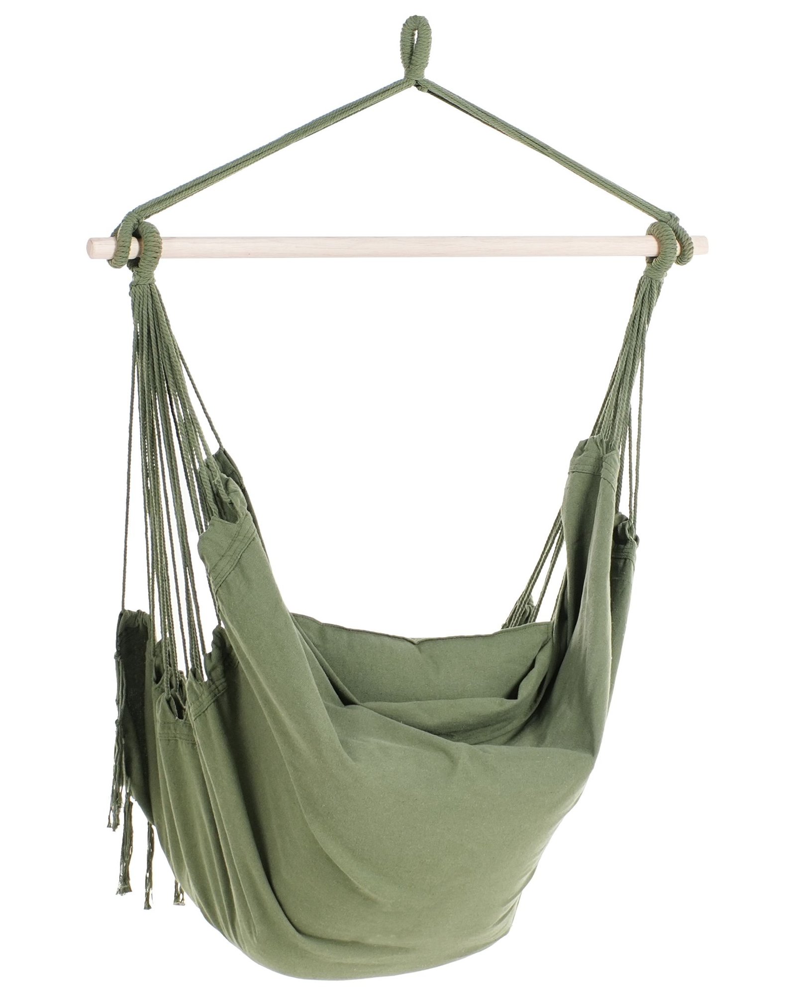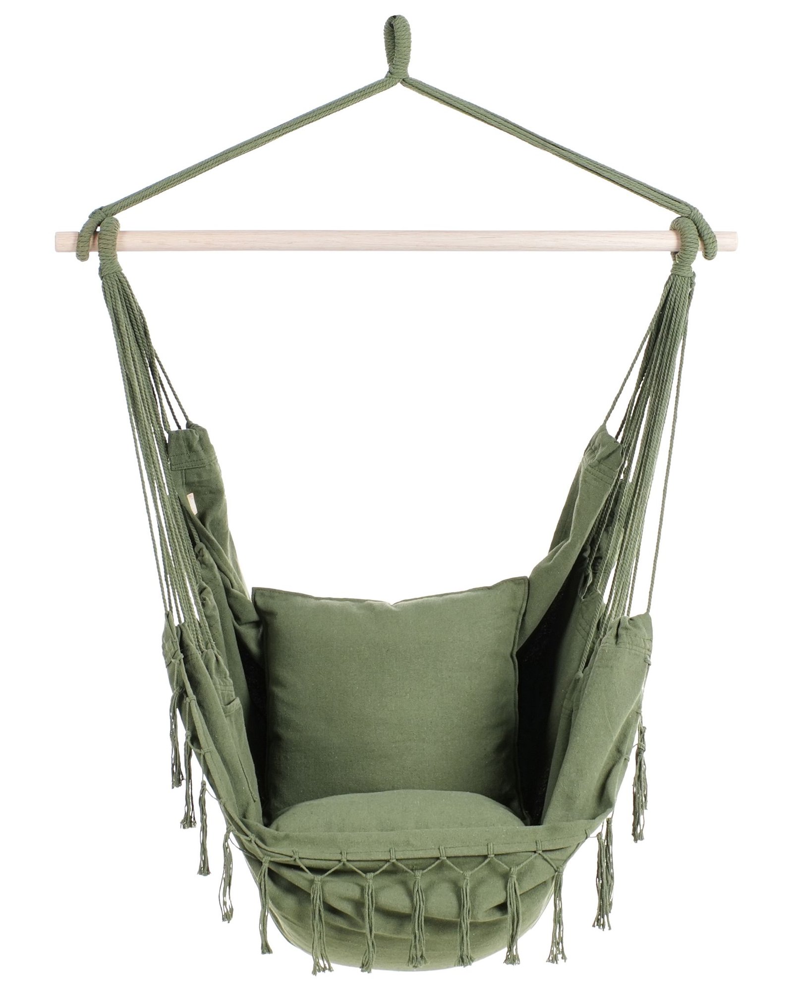 Pretty and functional, this hanging hammock will be a perfect finishing touch to a porch or a living area. Its seat is made from strong, quality fabric and decorated with tasteful tassels on the outline, brining in a Bohemian flair. There is a small pocket on one side, ideal for holding small accessories. Together with the included fitted cushions, it creates a superb spot to cuddle up and read a book or simply relax. The hammock comes fully assembled, packed in a fabric bag and ready to be mounted
