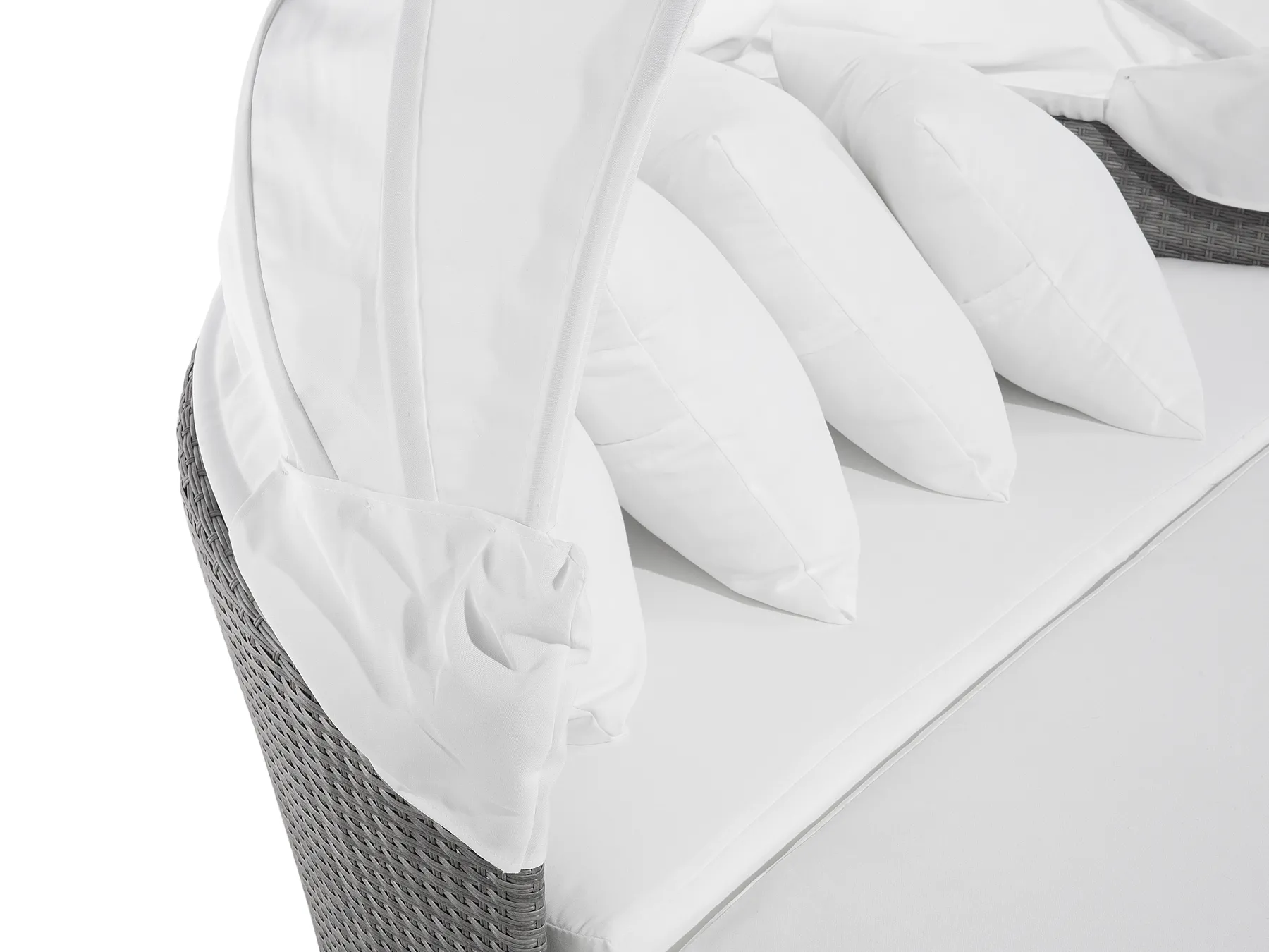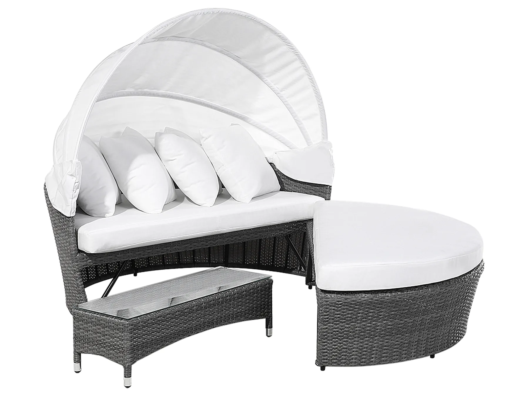 This garden daybed is the perfect combination of sturdy construction and elegant design. It will transform your outdoor living space, giving you a place to relax while remaining comfortable and cool. Make the most of this daybed’s versatility and turn it into a sofa, pull out the coffee table with ease and store it away again tidily. Soft cushions support your body, and the retractable white canopy provides cooling shade. The neutral colours are perfect for a range of garden designs.