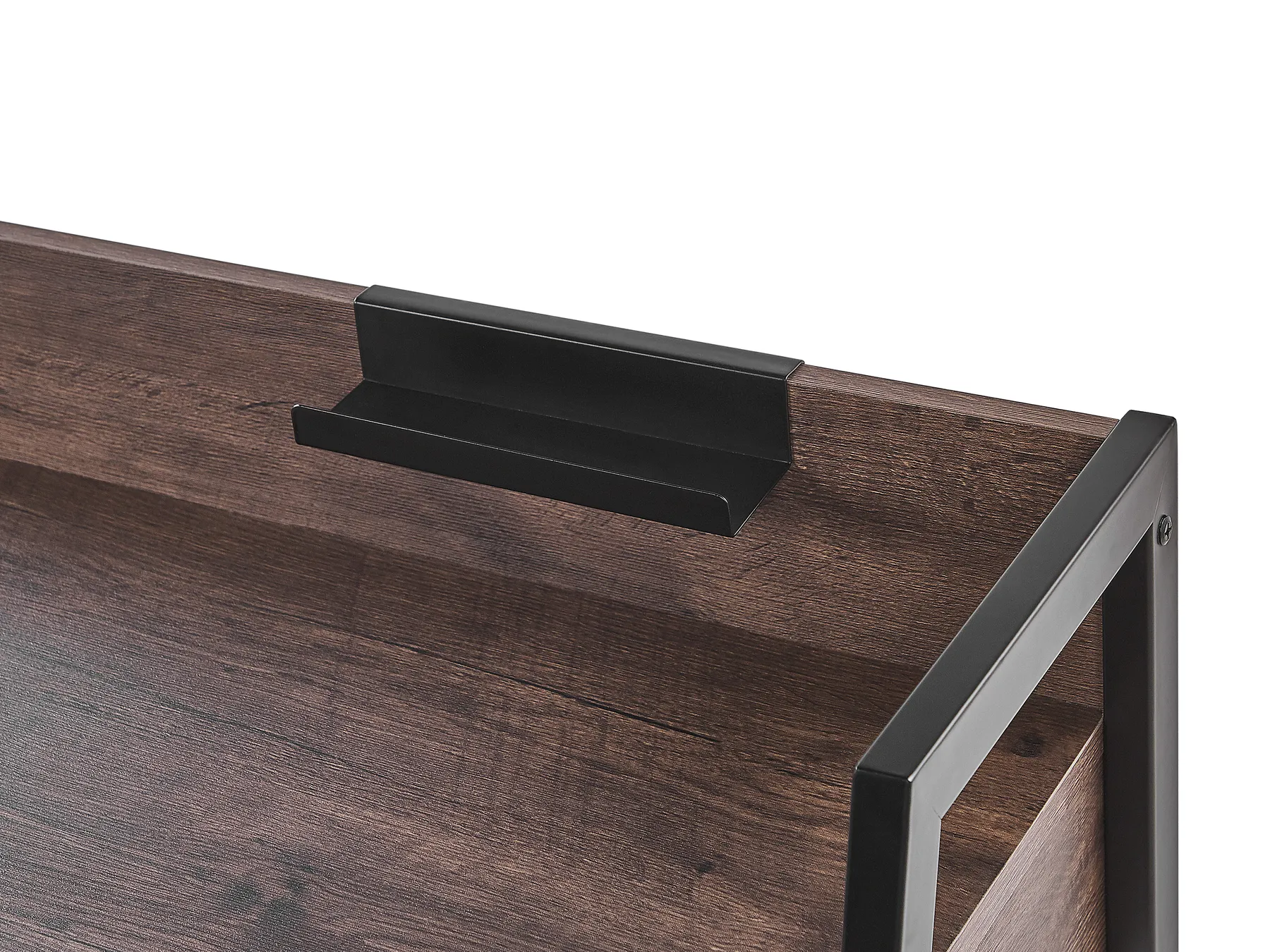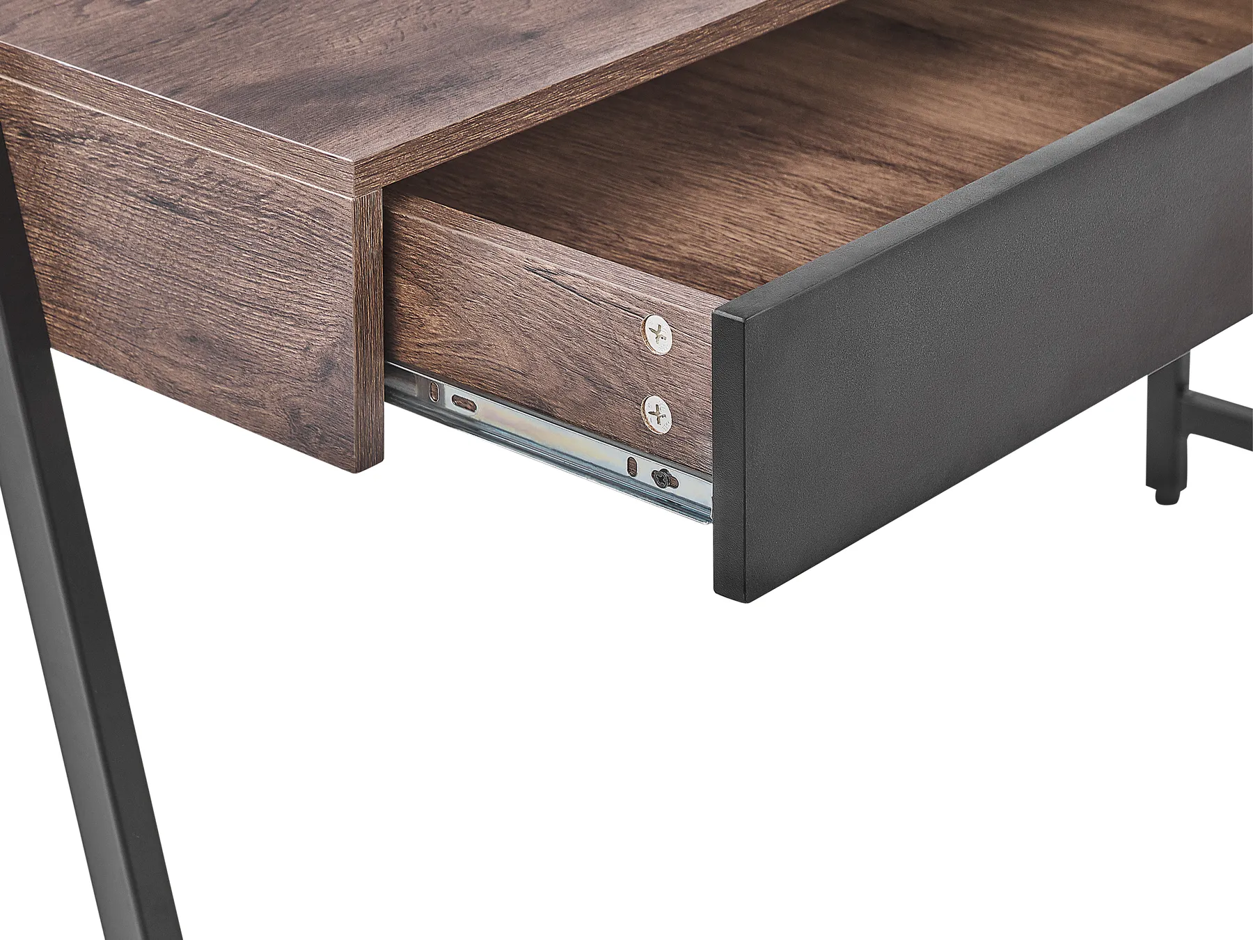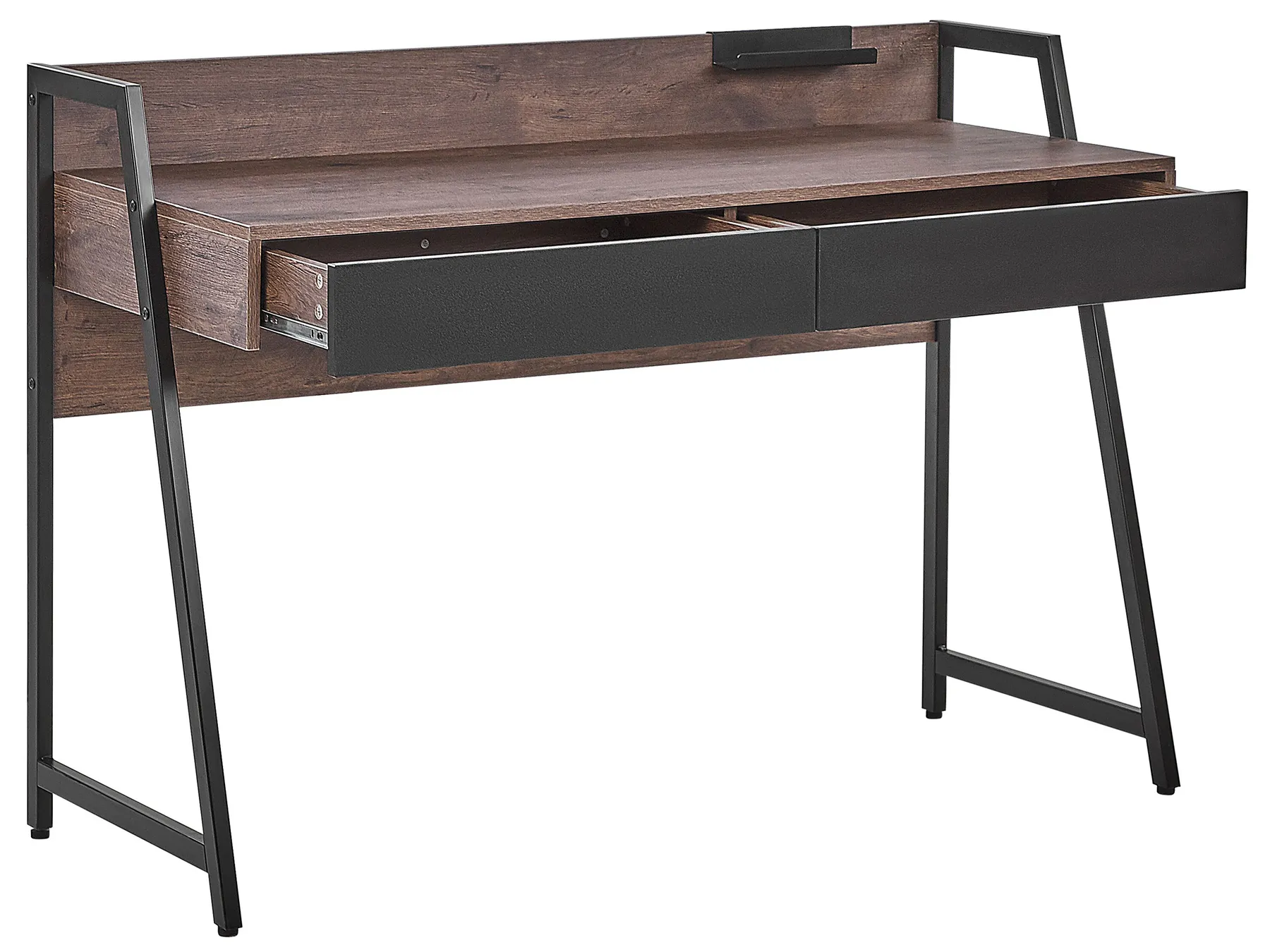 A functional home desk designed in a straightforward, minimalistic shape. The combination of the top in wood-like finish and black metal frame creates a piece of furniture that fits any modern space, from industrial to rustic. Two drawers can hide papers, cables or a small laptop. A small additional stand is perfect to hold a tablet or a mobile phone.