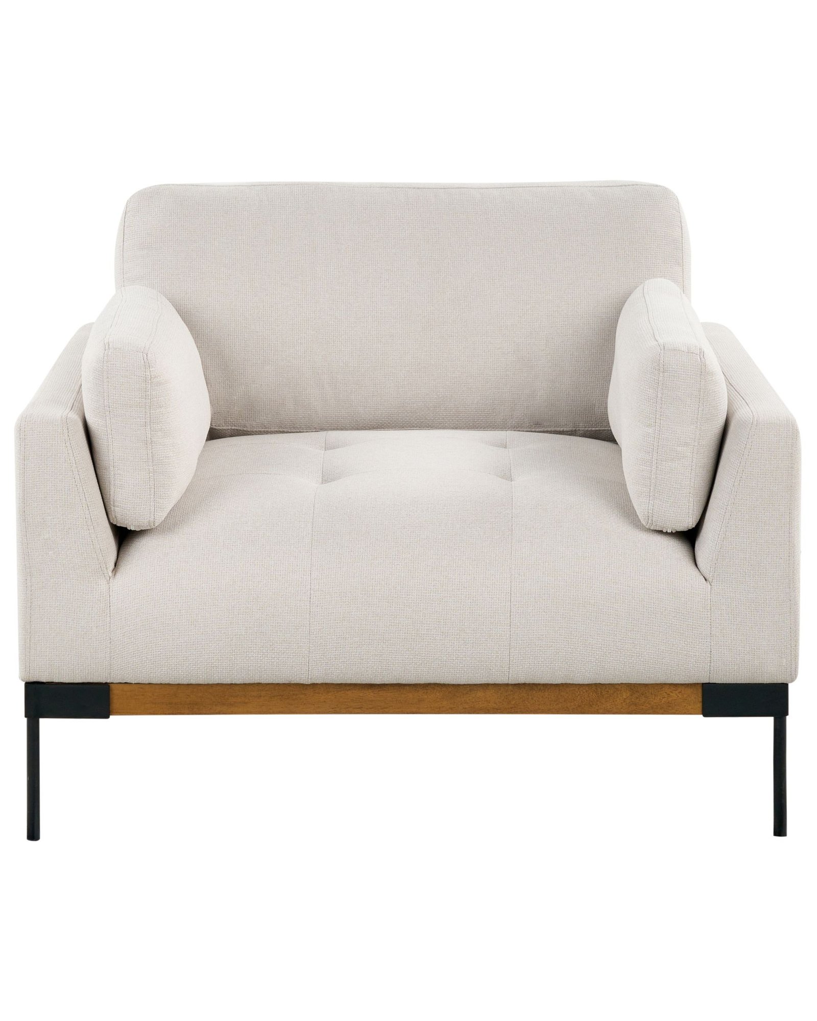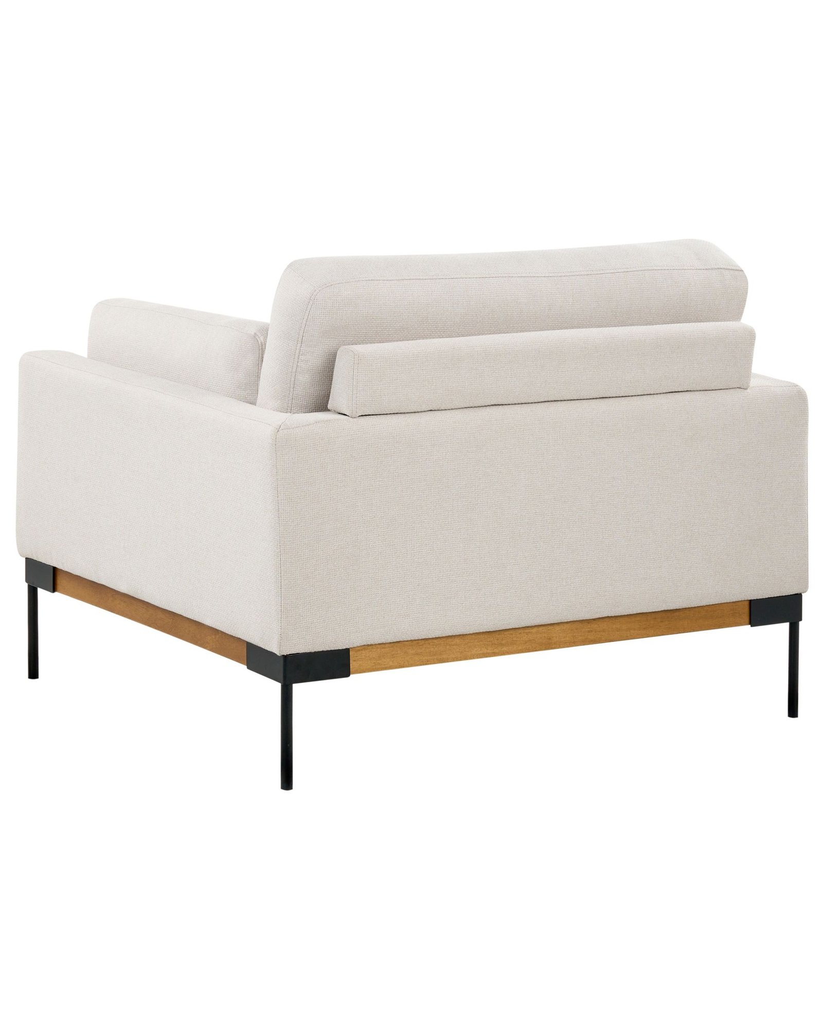 This modern armchair features two side bolsters for relaxing in comfort. Soft, easy-to-clean fabric provides ultimate comfort and quick and easy cleaning. The backrest bolsters have zippered covers for easy maintenance, while the sleek black wrought iron legs add a touch of elegance to any room. Stylish and practical, it’s ideal for relaxing or entertaining.