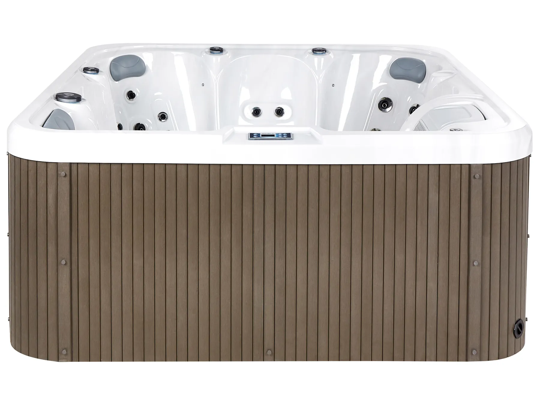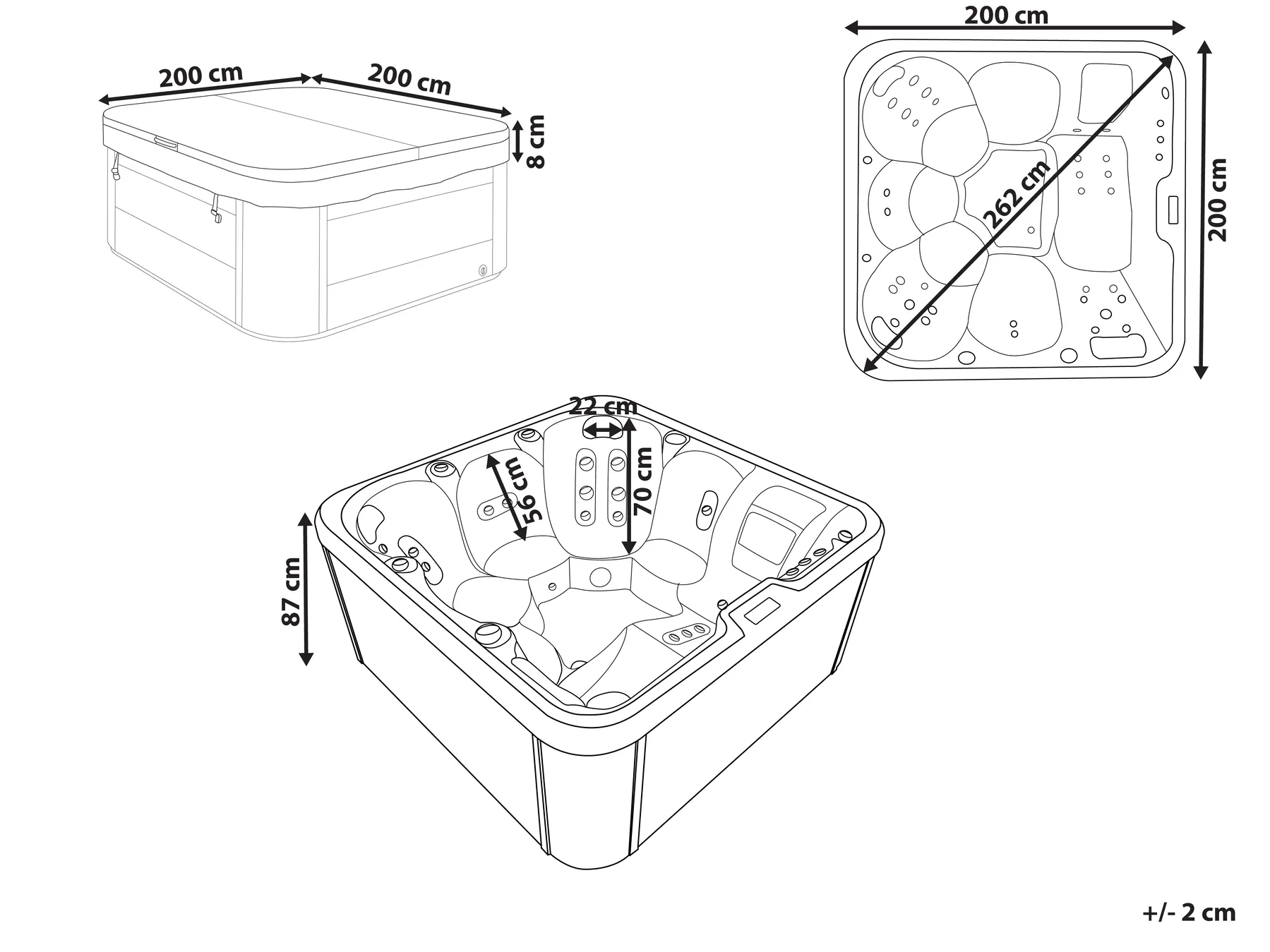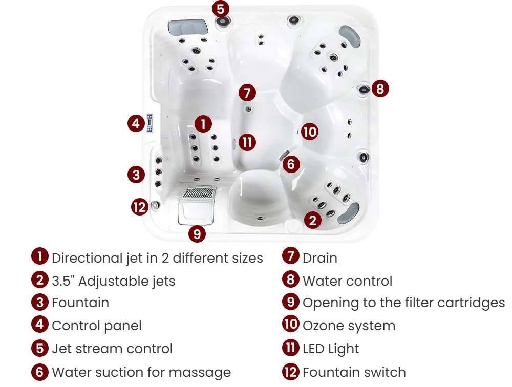 Enjoy ultimate relaxation with this durable outdoor hot tub, featuring an easy-clean acrylic interior and sleek stainless steel panels for lasting quality. With 33 nozzles providing a gentle water massage, a built-in control panel, and 9 multi-coloured underwater LED lights, it creates the perfect relaxation experience. Seating up to six, including a lounge spot for full-body relaxation, it’s ideal for unwinding. Complete with a cover for protection, this tub is made for year-round enjoyment.