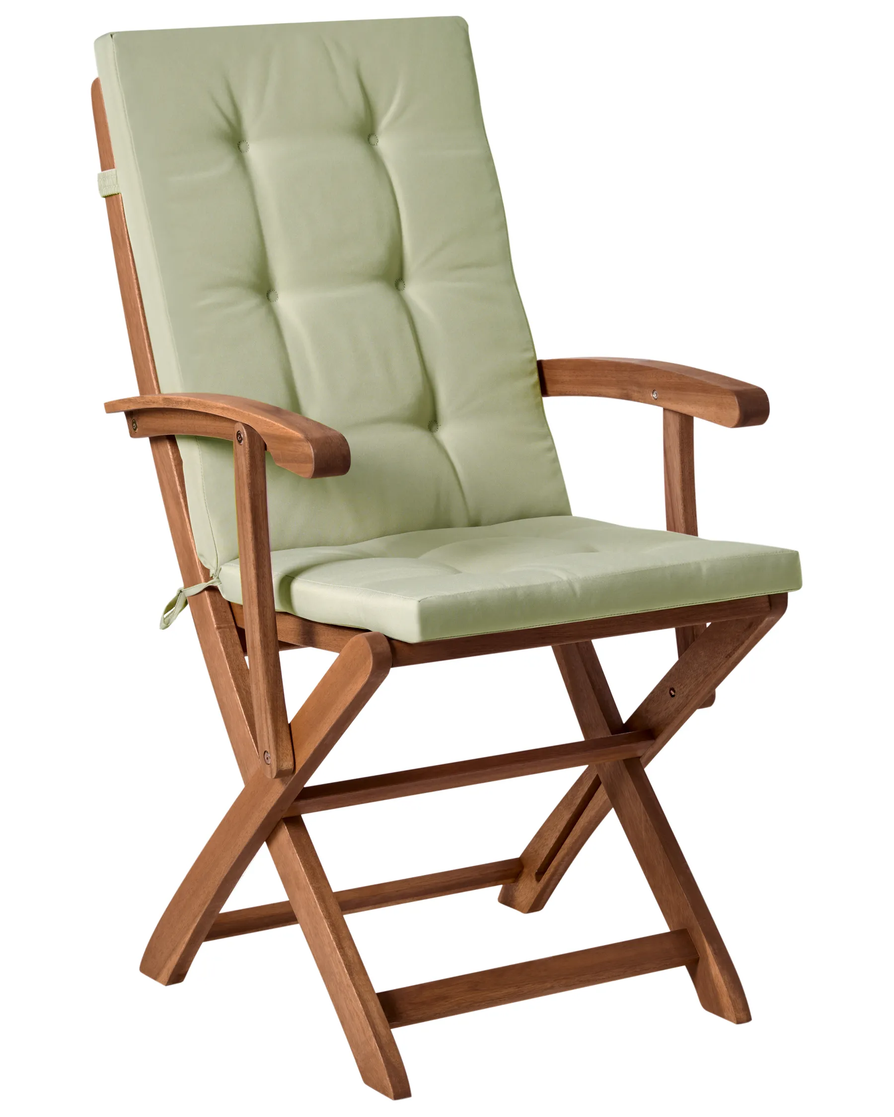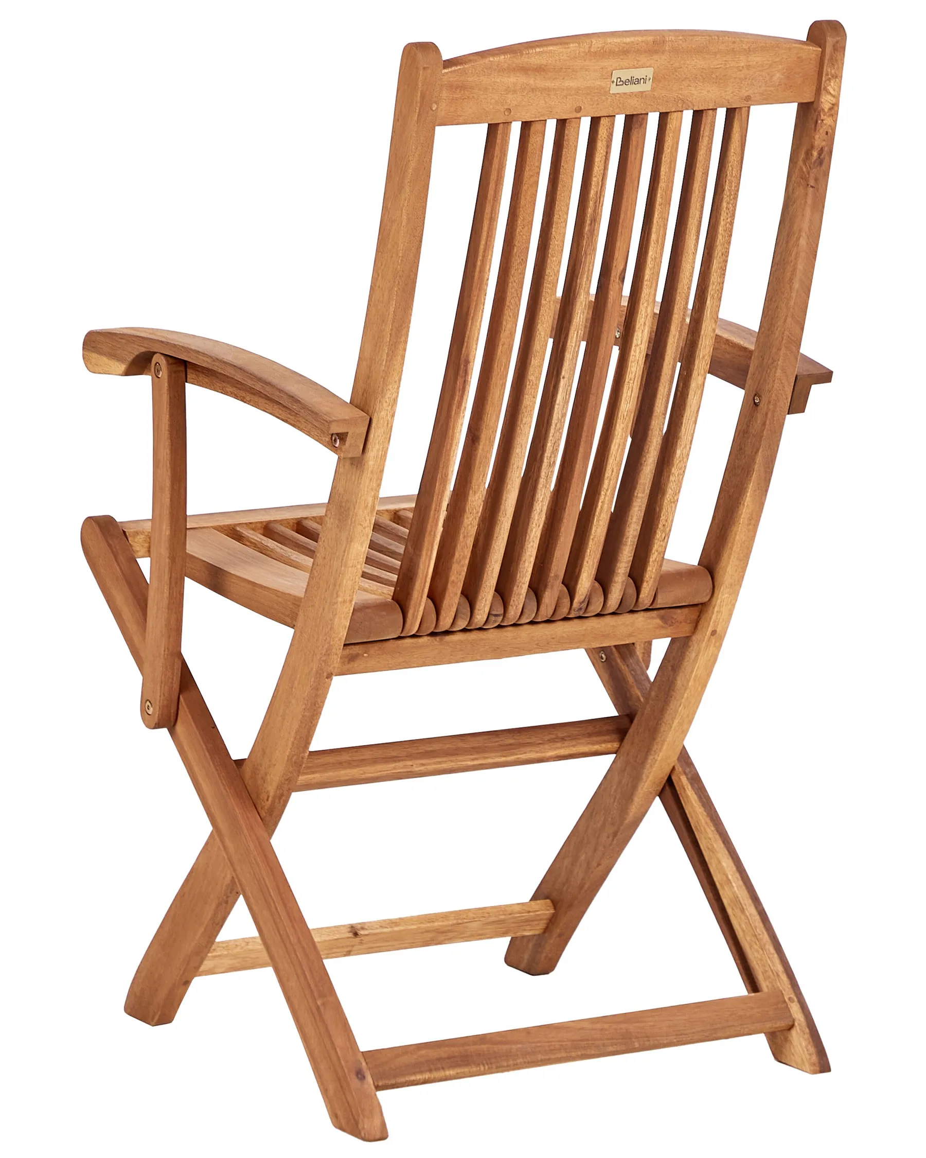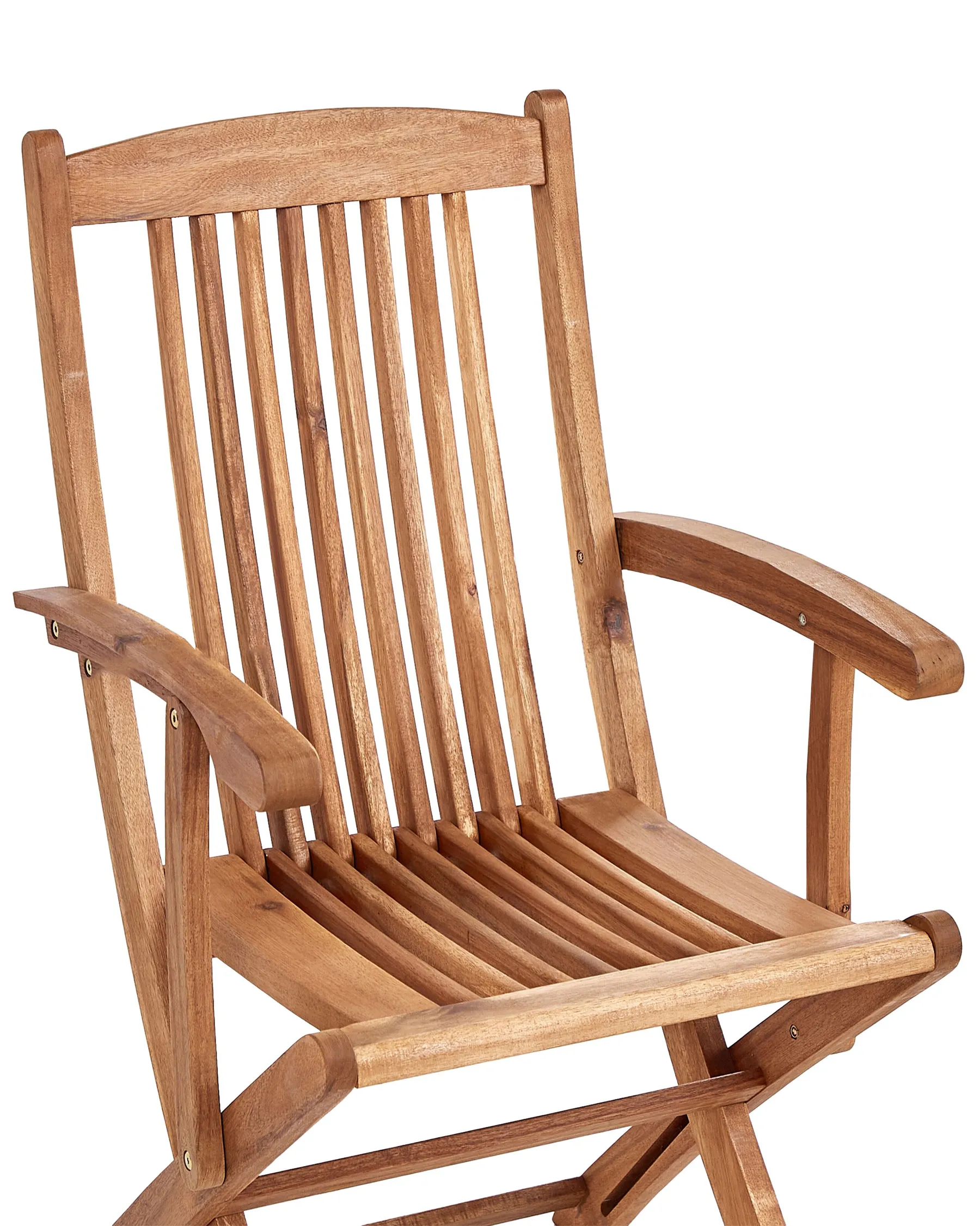 Elevate your outdoor dining experience with this stylish and functional set of foldable garden chairs. Crafted from premium acacia wood with a rich oiled finish, these chairs offer long-lasting durability and require minimal upkeep. The sleek armrests and high backrest provide exceptional comfort while accentuating the elegant slatted design. Each chair includes a plush seat and back cushion, generously filled with foam for superior comfort. The cushion covers are designed to resist fading and light rain, maintaining their fresh look all season long. Convenient tie-backs keep the cushions securely in place, even on windy days.