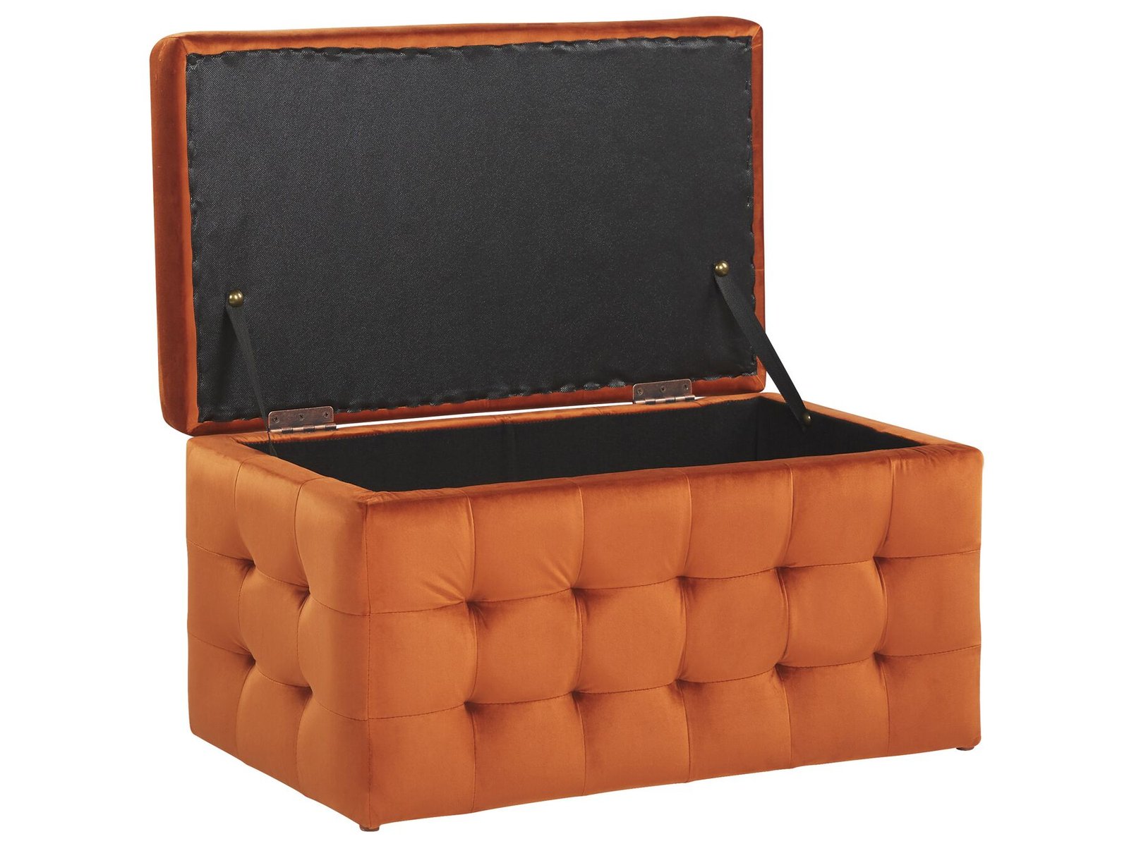This ottoman is a statement piece that will enrich any interior. It is constructed from a robust medium density fibreboard with a thick foam padding and covered in a vibrant orange-coloured velvet. The settee has a hinged top and can be used as an additional storage piece or a footstool. Its classic button-tufted upholstery and neutral shade make this ottoman a versatile piece of furniture.